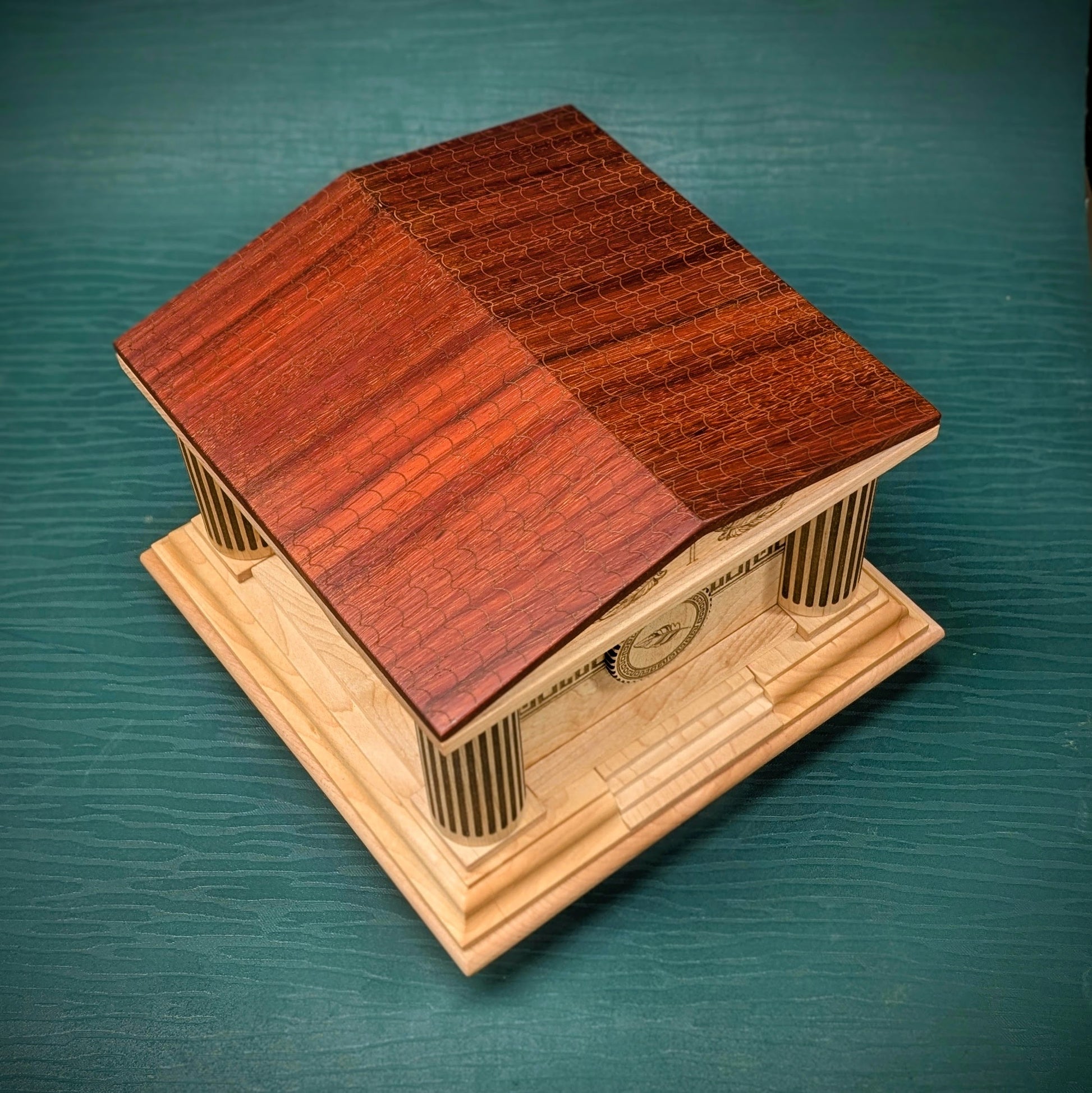 Handcrafted from solid Canadian maple hardwood and African padauk. Measures approximately 25 × 25 × 16 cm (9-¾” × 9-¾” × 6-¼”), weighs about 7 lbs (~3 kg).